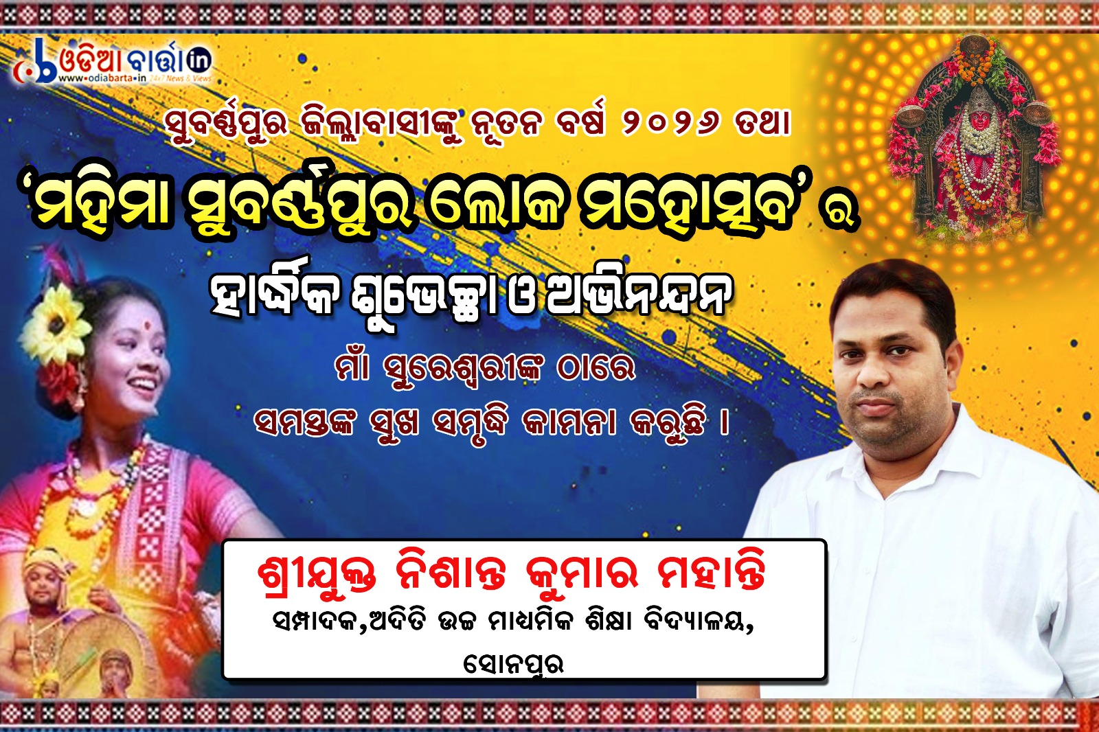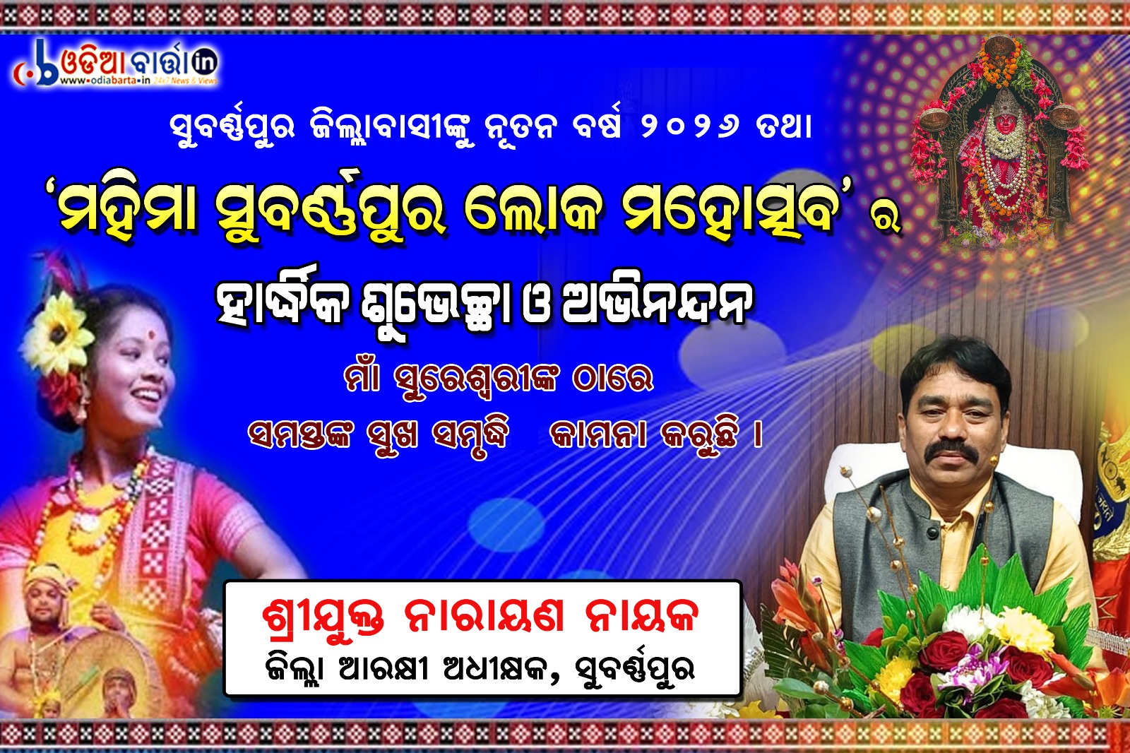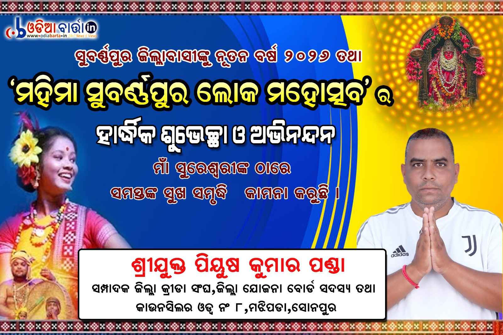ଓଡିଆ ବାର୍ତ୍ତା/ ସୁବର୍ଣ୍ଣପୁର (ରାଜ କିଶୋର ତ୍ରିପାଠୀ): ସୁବର୍ଣ୍ଣପୁର ଜିଲ୍ଲାର କଳା, ସଂସ୍କୃତି, ଐତିହ ଓ ବିକାଶ ଧାରାର ବାର୍ତ୍ତାଵହ ୩୨ ତମ “ମହିମା” ସୁବର୍ଣ୍ଣପୁର ଲୋକ ମହୋତ୍ସବ ୨୦୨୬ ଓ ରାଜ୍ୟ ସ୍ତରୀୟ ପଲ୍ଲୀଶ୍ରୀ ମେଳାର ତୃତୀୟ ସନ୍ଧ୍ୟାରେ ପ୍ରବଳ ଜନ ସମାଗମ ଦେଖିବାକୁ ମିଳିଥିଲା।